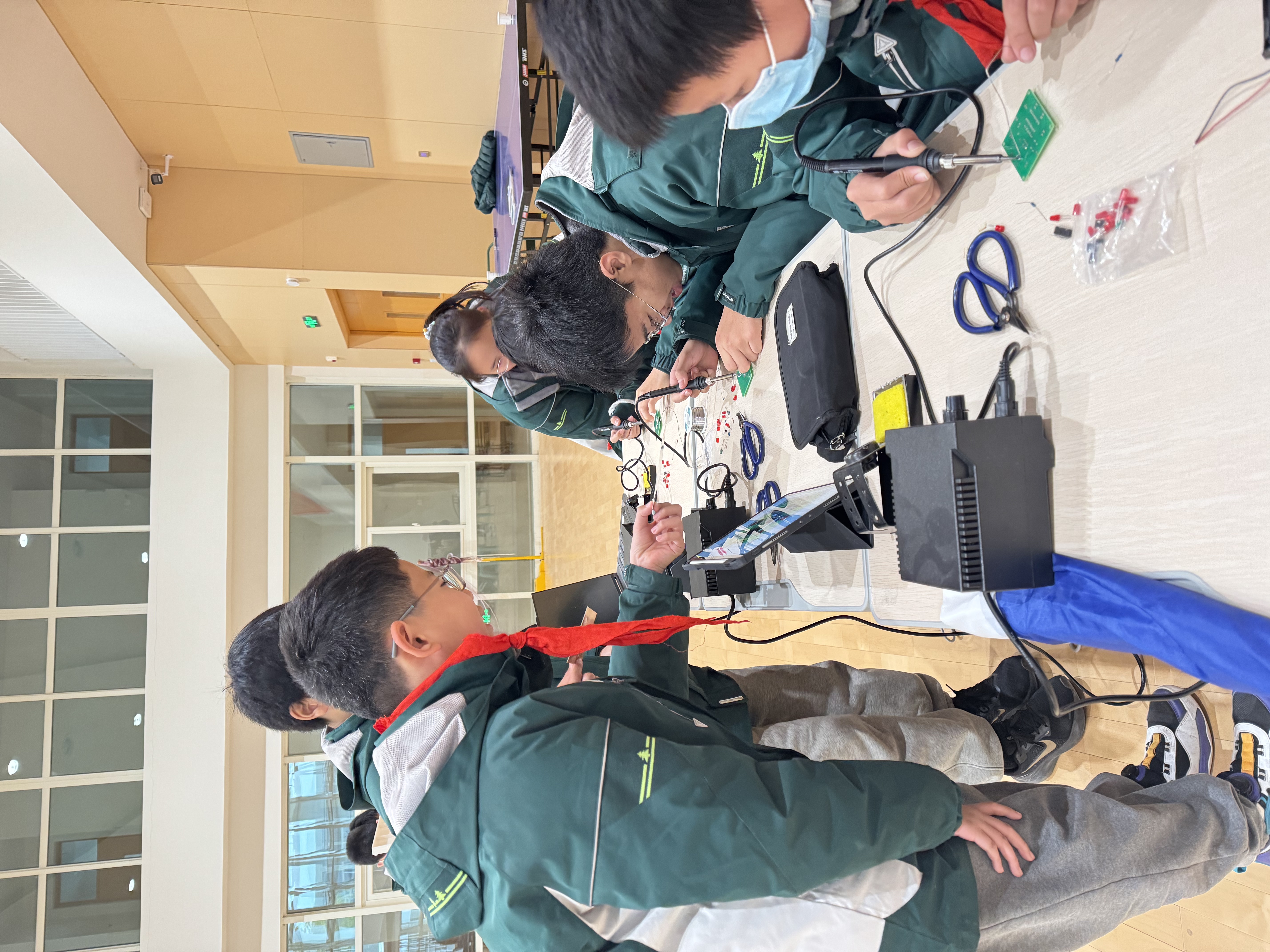 活动现场,志愿服务队将器材有序分发至每位学生手中,并通过通俗易懂的语言讲解焊接原理、电路结构及安全注意事项。“大家焊接时要保持手稳,先将焊锡丝轻触焊点,待焊锡融化后迅速移开,避免出现虚焊哦!” 志愿者们一对一俯身指导,手把手纠正操作姿势,耐心解答 “为什么灯不亮”“焊点怎么才算合格”等问题。