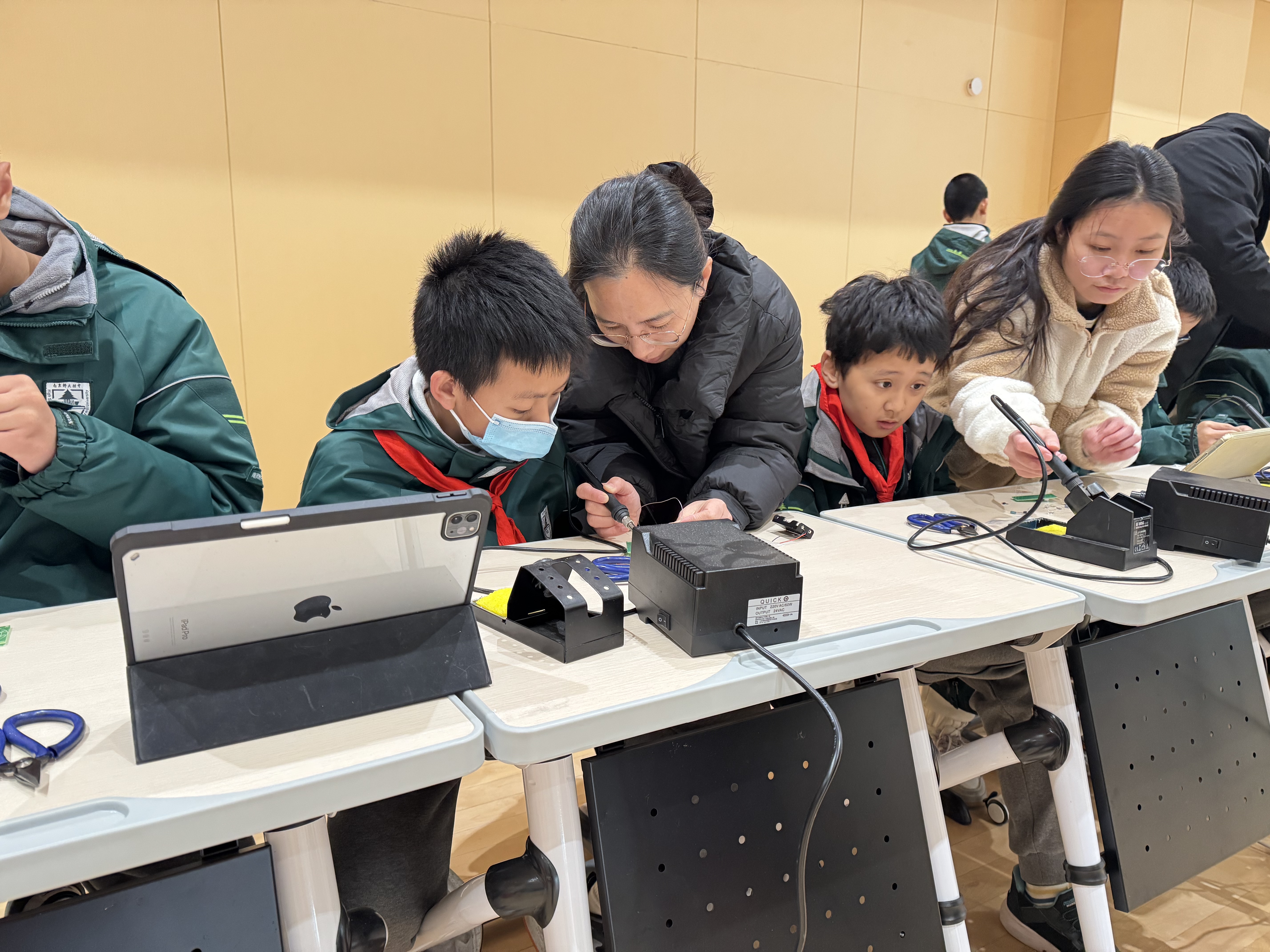 为确保活动顺利开展,前期两支部充分联动、精心筹备。老师们结合初中生认知特点,反复筛选并优化实践项目,最终确定声控灯、幸运转盘、光控感应灯三个安全性高、趣味性强且贴近生活的焊接小制作;学生党员在教师指导下,提前完成器材清点、焊接流程预演及安全操作培训,确保能为初中生提供专业且耐心的指导。